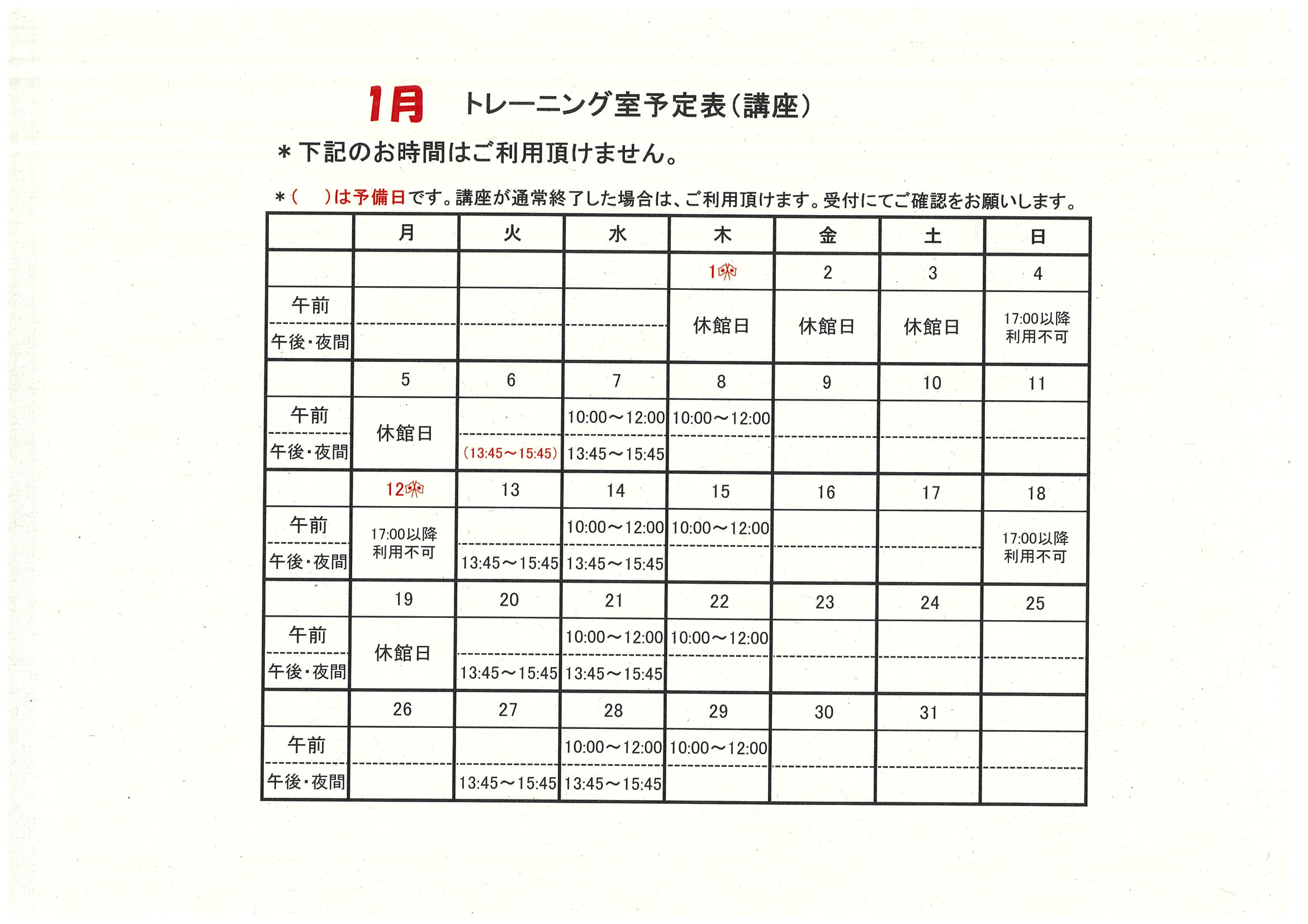 1月「トレーニング室」予定表 定例講座・同好会の時間以外はご …