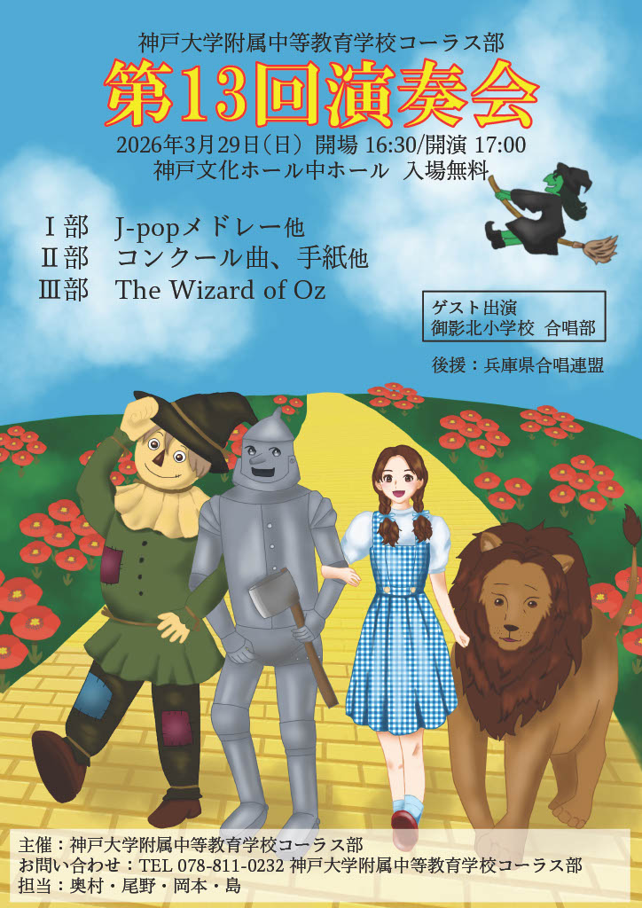 入場料:無料・自由席 | お問い合わせ: 神戸大学附属中等教育学校コーラス部 078-811-0232 |