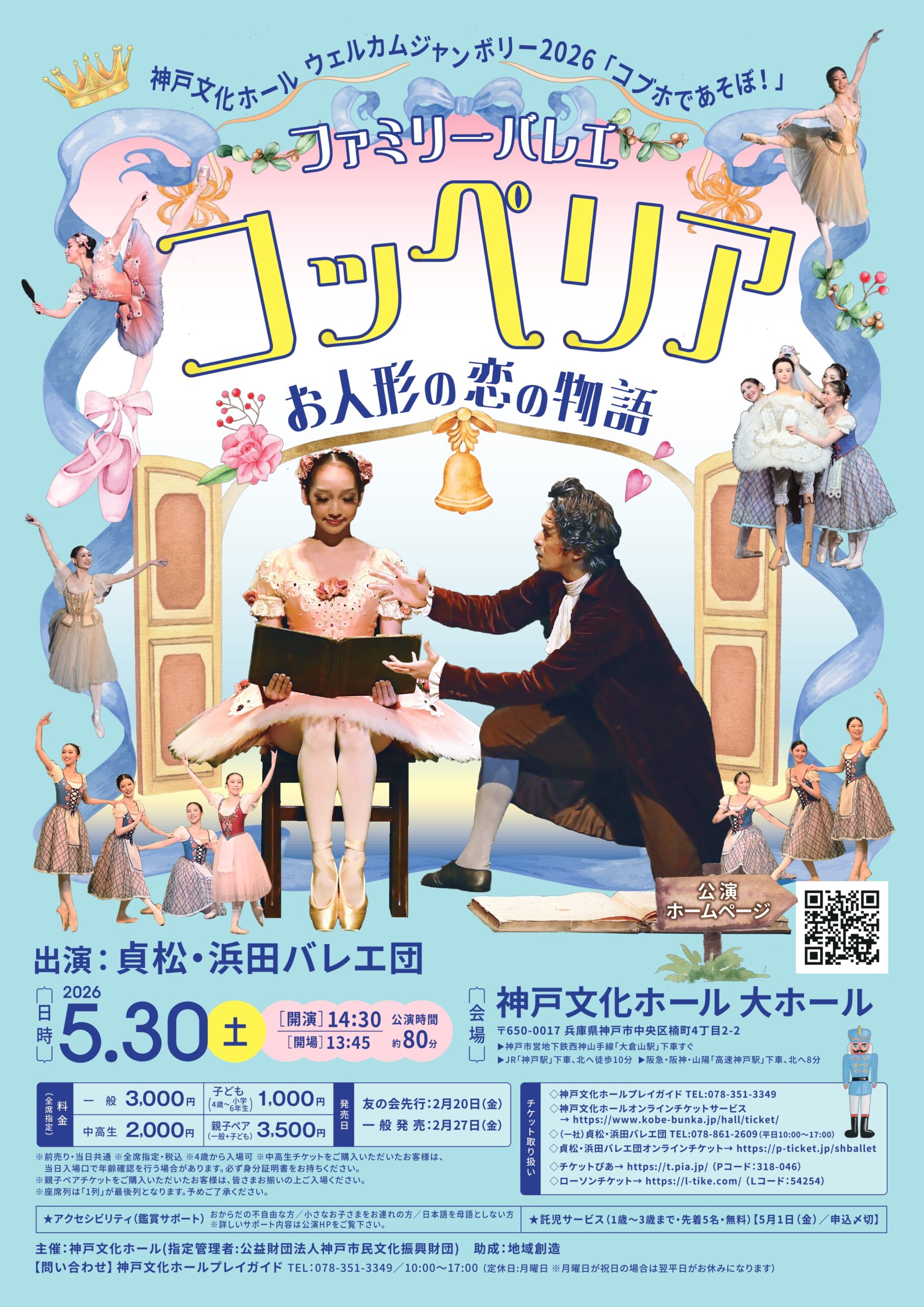 | チケット | ■コッペリア 一般 3,000円 中高生 2,000円 子ども(4歳~小学6年生) 1,000円 親子ペア(一般+子ども) 3,500円 ※前売り・当日共通 ※全席指定・税込 ※4歳から入場可 ※子ども・中高生チケットをご購入いただいたお客様は、当日入場口で年齢確認を行う場合があります。必ず身分証明書をお持ちください。 ※親子ペアチケットをご購入いただいたお客様は、皆さまお揃いの上ご入場ください。 ※座席列は「1列」が最後列となります。予めご了承ください。 ■こども邦楽コンサート 500円 ※前売り・当日共通 ※全席自由・税込 ※未就学児入場可(お琴の体験コーナーは小中学生が対象) ※3歳以上要チケット、3歳未満は1人まで膝上鑑賞無料 |