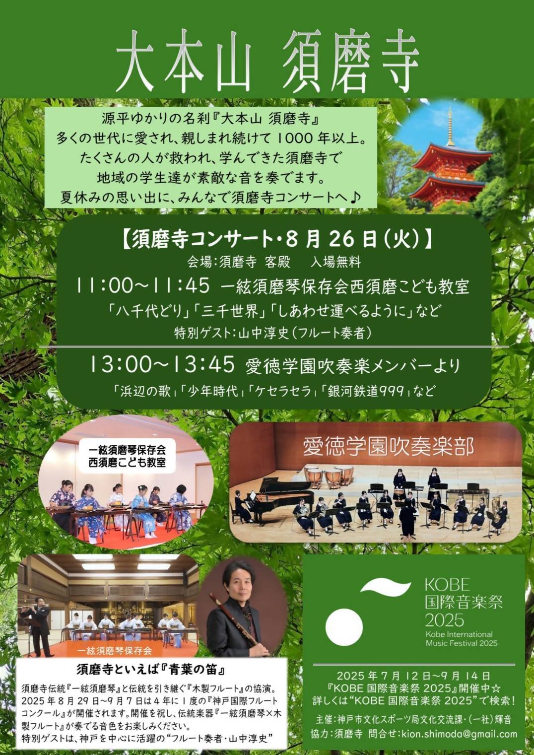 多くの世代に愛され、親しまれ続けて1000年以上。たくさんの人が救われ、学んできた須磨寺で地域の学生達が素敵な音を奏でます。夏休みの思い出に、みんなで須磨寺コンサートへ♪