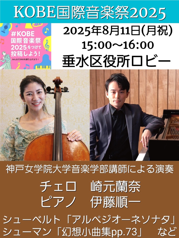 | 出演者 | ① 学生公演 魚崎中学校2年 光田楓(ピアノ、ヴァイオリン)、小林西神女学院中学校3年 安東優月(ヴァイオリン)他 ② 学生公演 神戸女学院大学音楽学部大学院1年 久野綾香(フルート)、村田沙耶(ピアノ)、苅屋知絵里(ピアノ)、別所香穂(声楽)、丸山泉美(ピアノ) ③ 神戸女学院大学講師による演奏 崎元蘭奈(チェロ)、伊藤順一(ピアノ) |