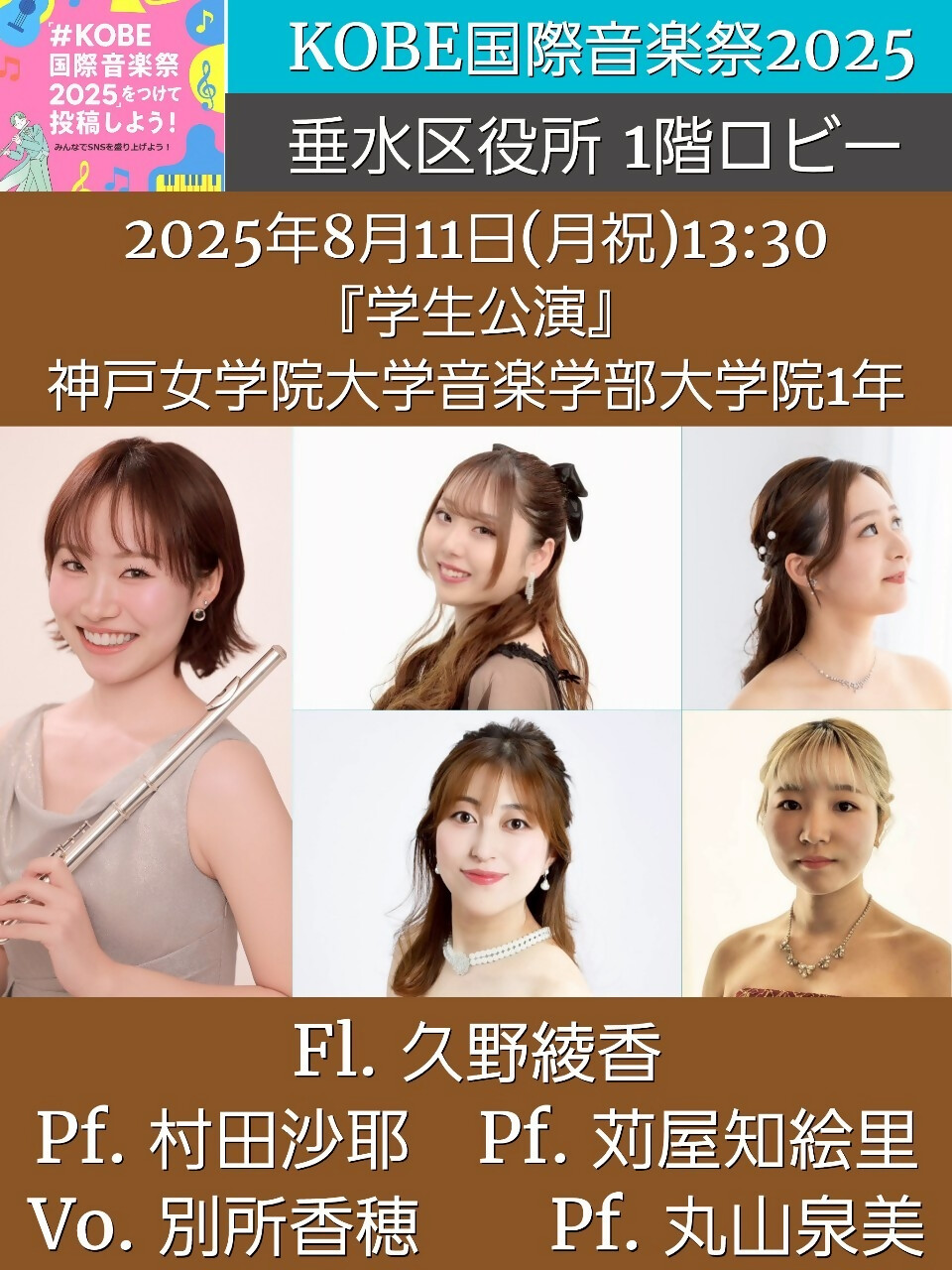② 学生公演 神戸女学院大学音楽学部大学院1年 久野綾香(フルート)、村田沙耶(ピアノ)、苅屋知絵里(ピアノ)、別所香穂(声楽)、丸山泉美(ピアノ)