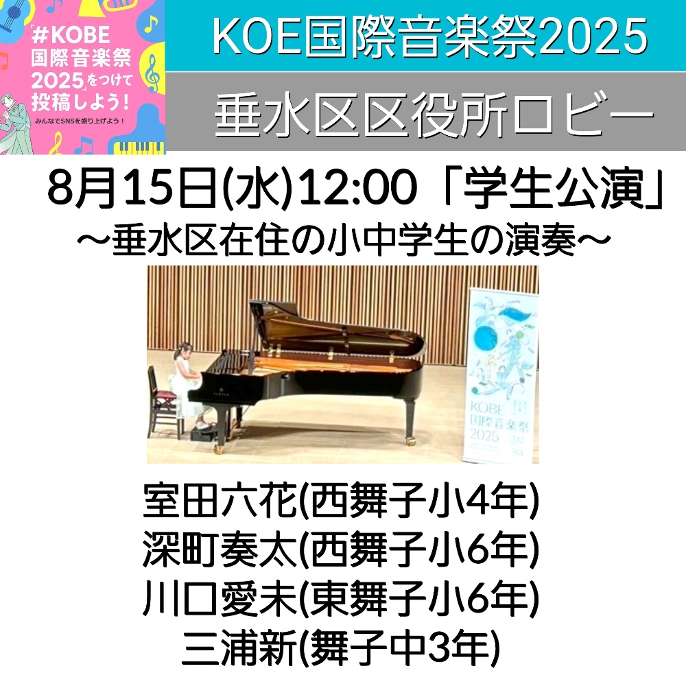 | 出演者 | 学生公演 垂水区在住の小中学生の演奏 西舞子小学校4年 室田六花、西舞子小学校6年 深町奏太、東舞子小学校6年 川口愛美、舞子中学校3年 三浦新 |
