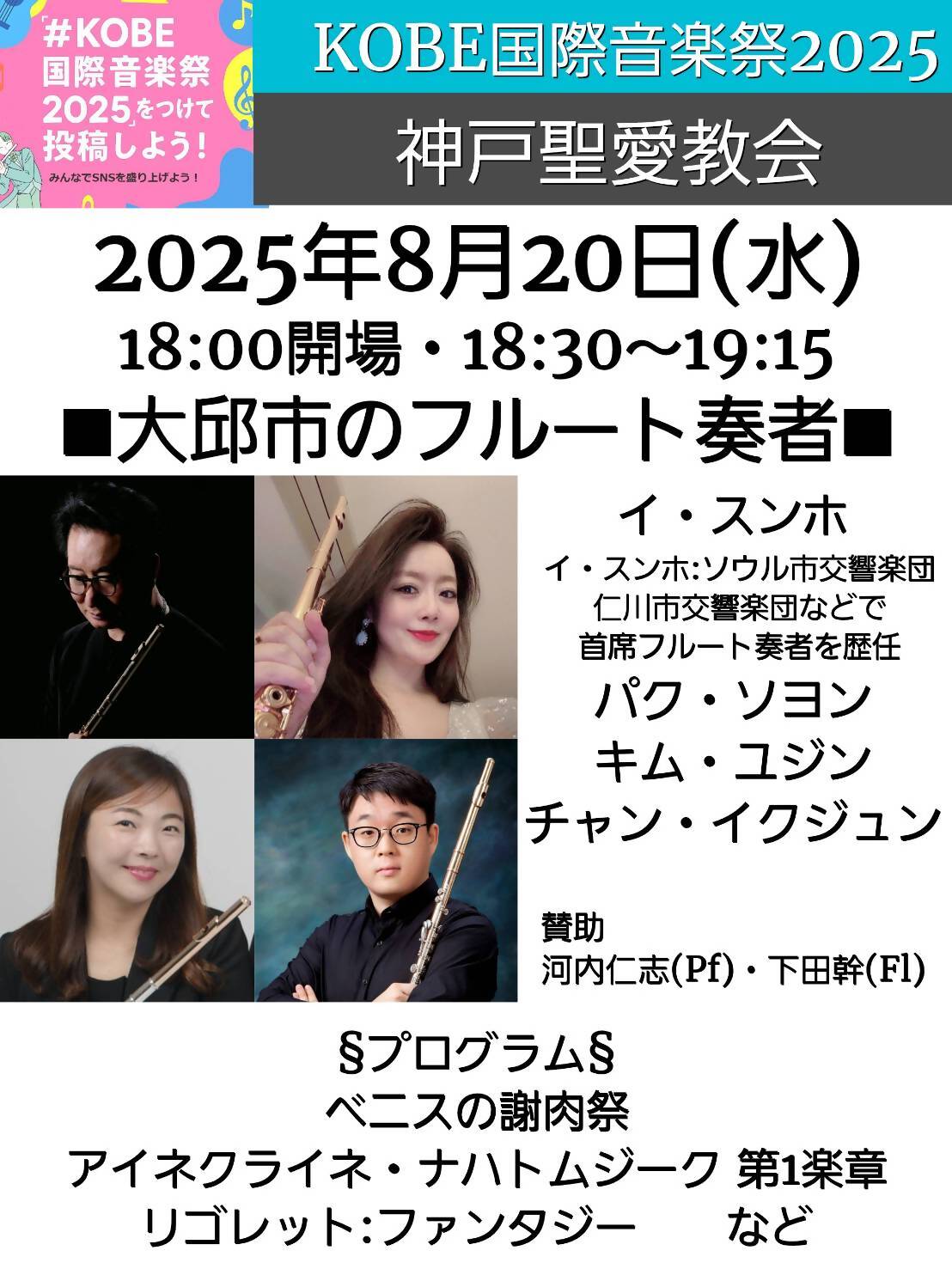 大邱市のフルート奏者 イ・スンホ(フルート)、パク・ソヨン(フルート)、キム・ユジン(フルート)、チャン・イクジュン(フルート)、賛助 河内仁志(ピアノ)、下田幹(フルート)