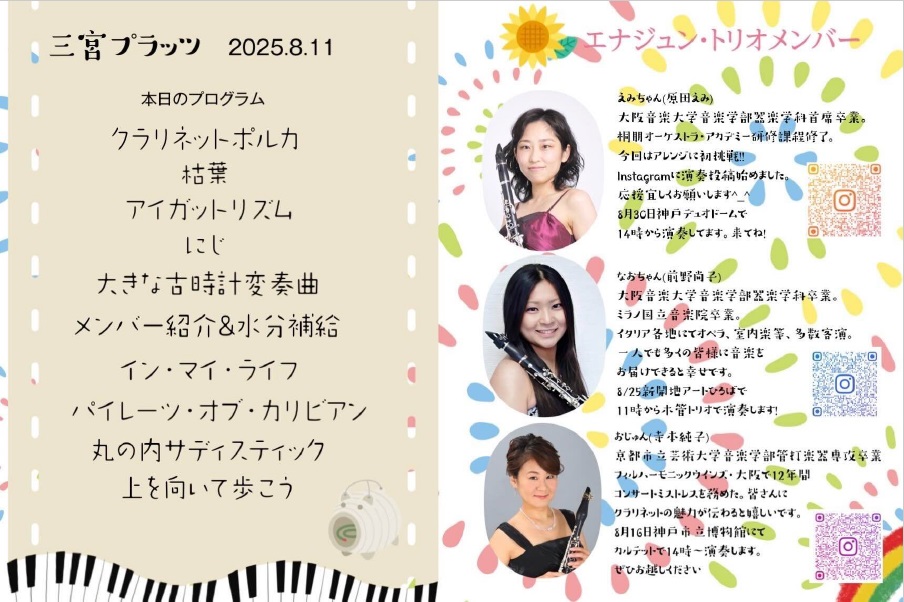 しっとり癒し系からリズミカルサウンド、お洒落な神戸に馴染む3本のクラリネットによる音色をお楽しみ下さい。