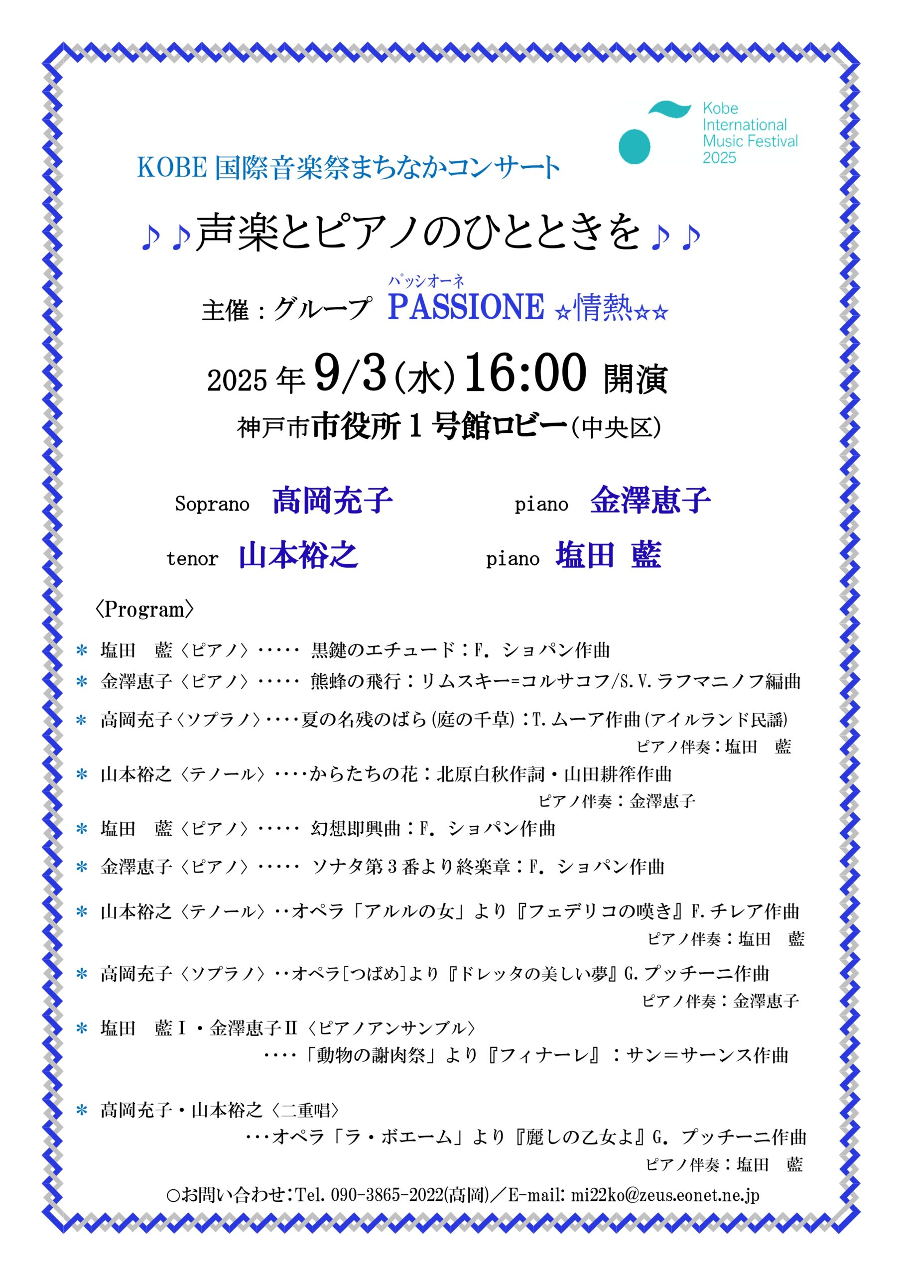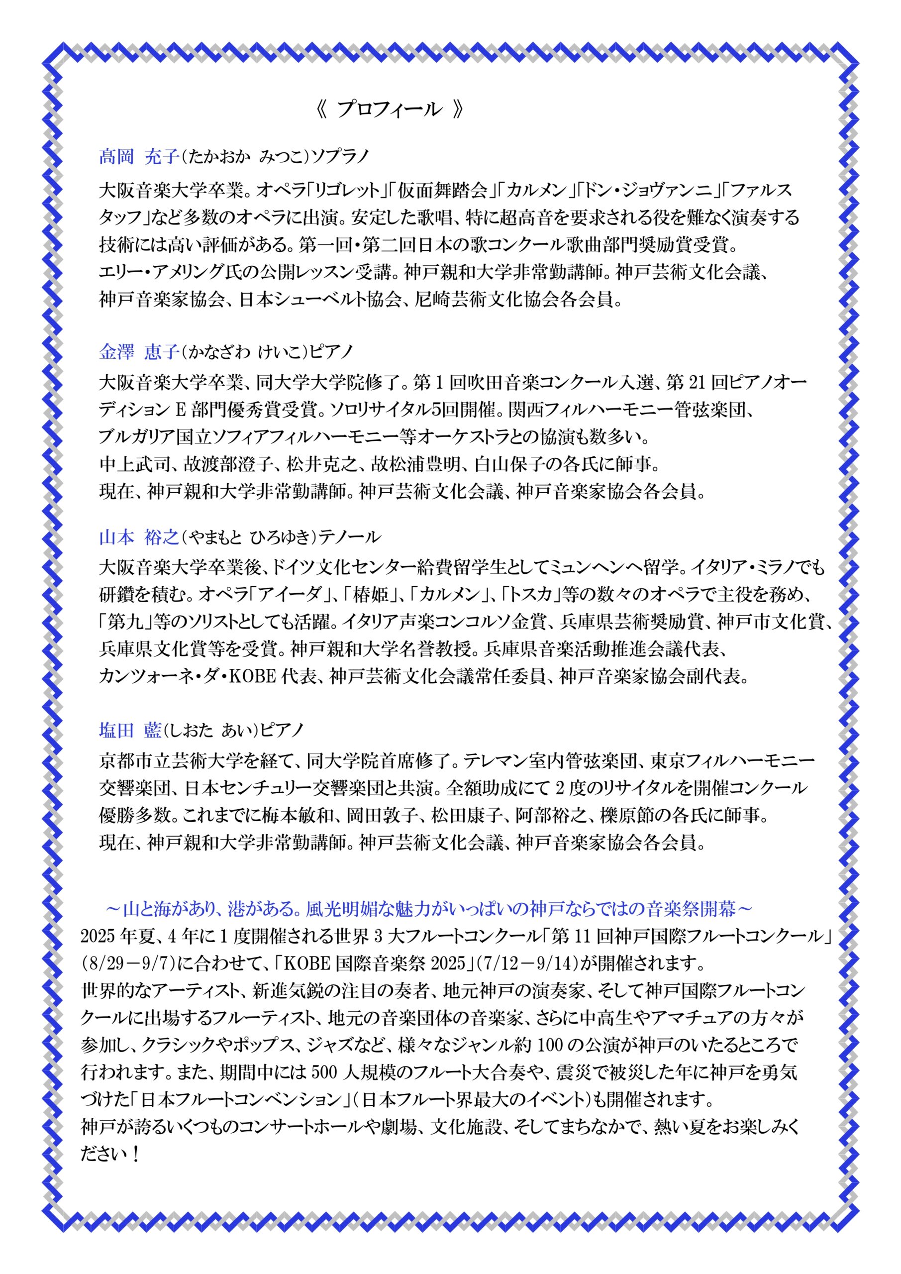 | 出演者 | 髙岡充子(ソプラノ)、金澤恵子(ピアノ)、山本裕之(テノール)、塩田藍(ピアノ) |