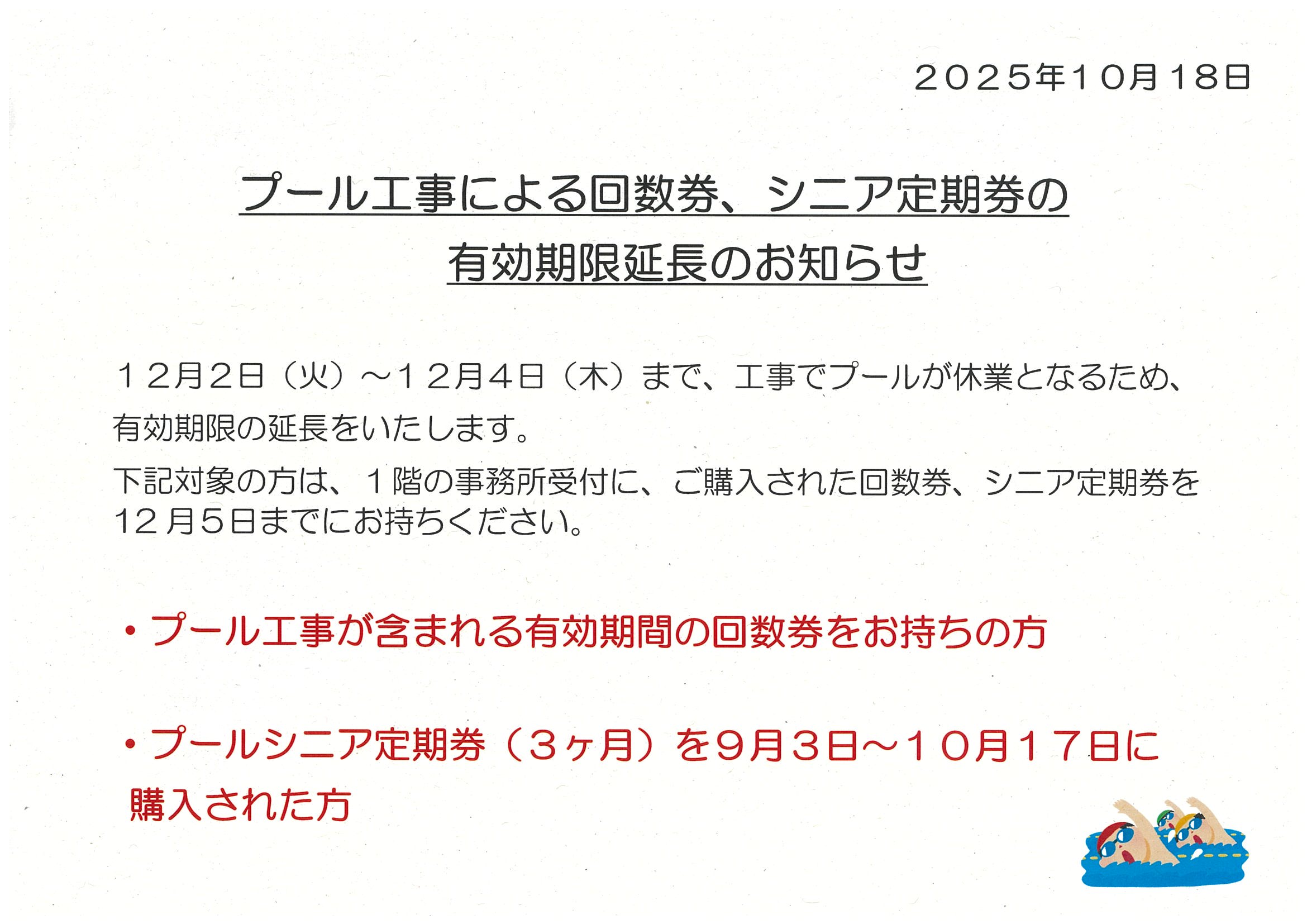 プール工事による回数券、シニア定期券の有効期限延長のお知 …