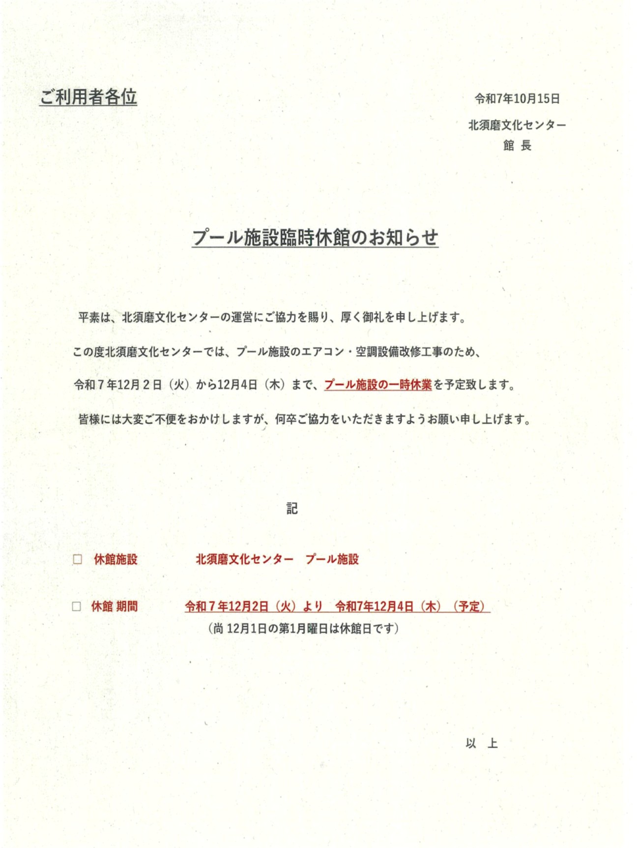 【北須磨文化センター】プール施設臨時休館のお知らせ …